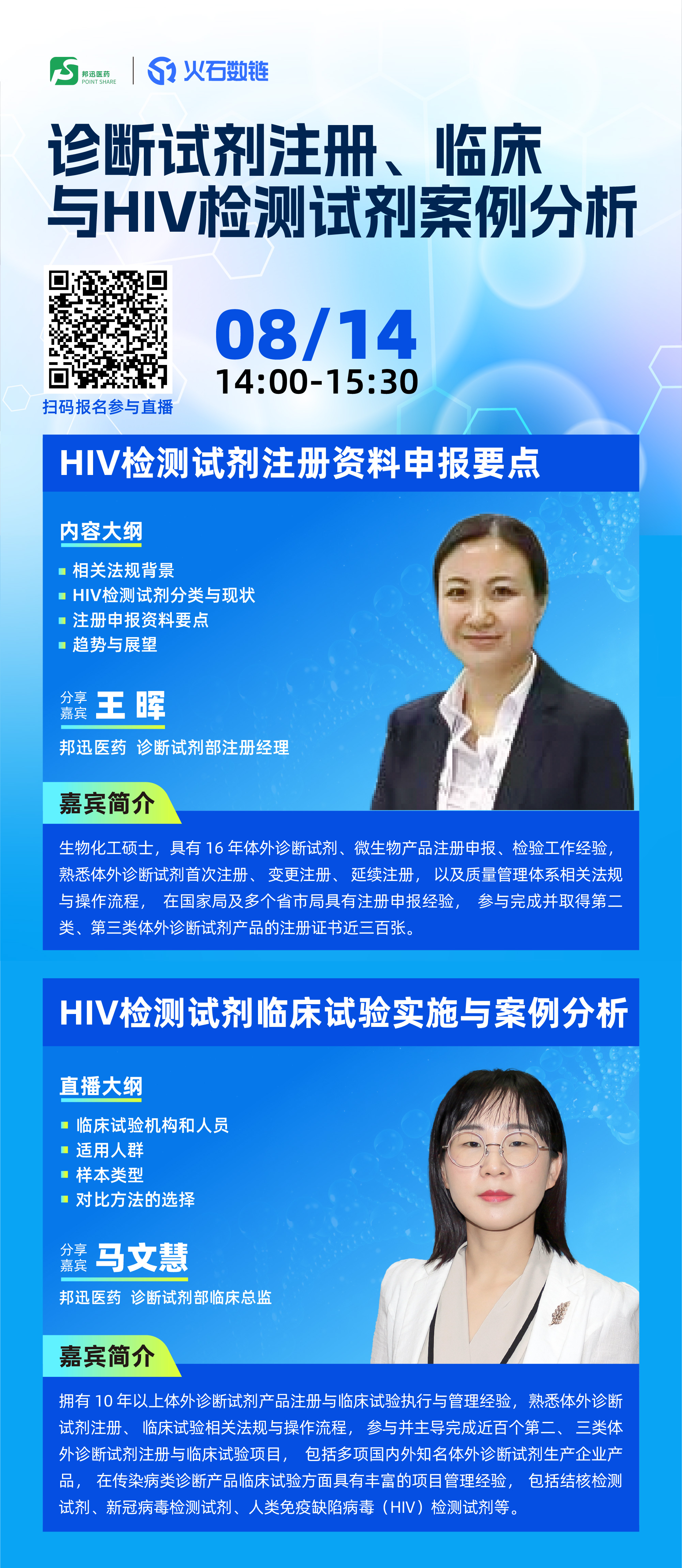 邦迅医药受火石数链邀请,8月14日14:00-15:30在药械课堂进行《HIV检测试剂临床试验实施与案例分析》与《HIV检测试剂注册资料申报要点》的主题分享,欢迎业内同行线上讨论交流。